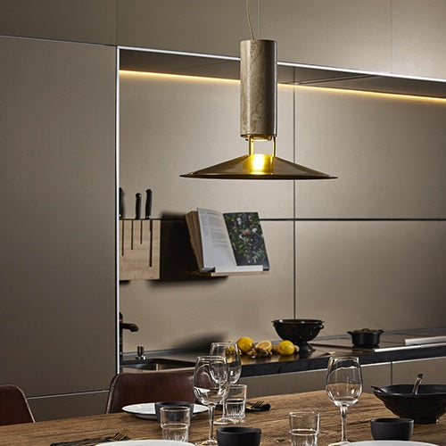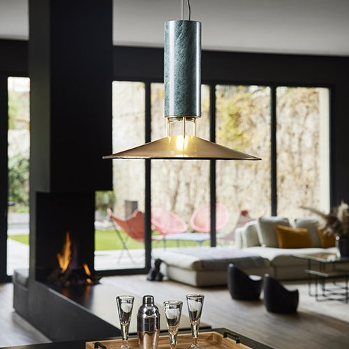 リバウンドは大理石と真鍮製のセードによる特別な存在感が魅力のペンダント照明です。天然のマーブル模様は、ハイエンドなインテリアに調和し、空間に統一感と、気品ある雰囲気をもたらします。セードの仕様に特徴があり、通常の真鍮に加え、レザーが内張されたバージョンも備えています。レザーの質感は、光の表情に変化を与え、見る角度で異なる印象を演出します。