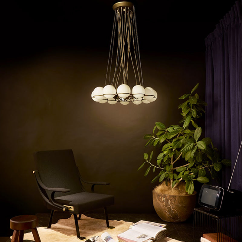 「LeSfere」は、イタリア照明を代表するデザイナー、ジノ・サルファッティがデザインした照明コレクション。「球体」を意味するこのシリーズは、惑星に着想を得てデザインされました。コードの配線が立体的な放物線を描く、美的な要素として取り入れられている点は、氏の代表作であり、世界的なベストセラー照明「Model 2097」を思い出させます。圧倒的な存在感と華やかさを備える本作はカルロ・モリーノとマルチェロ・ザベラーニ・ロッシの設計による、イタリア・トリノの歌劇場「レージョ劇場」にも採用されています。