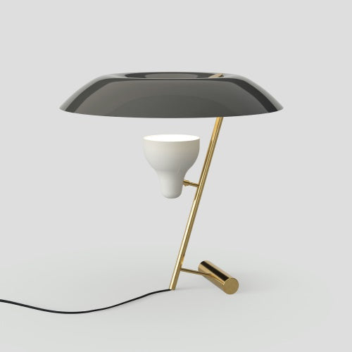 白く塗装されたアルミニウムのスポットライトは、真鍮製のステムに取り付けられており、ベースにある円筒形のパーツは、モデル カウンターウェイトの役割を果たしています。ボディの仕上げは艶消しのブラックとポリッシュブラスの2種類用意されており、前者はよりモダンな印象で、後者はラグジュアリーな印象を与えます。