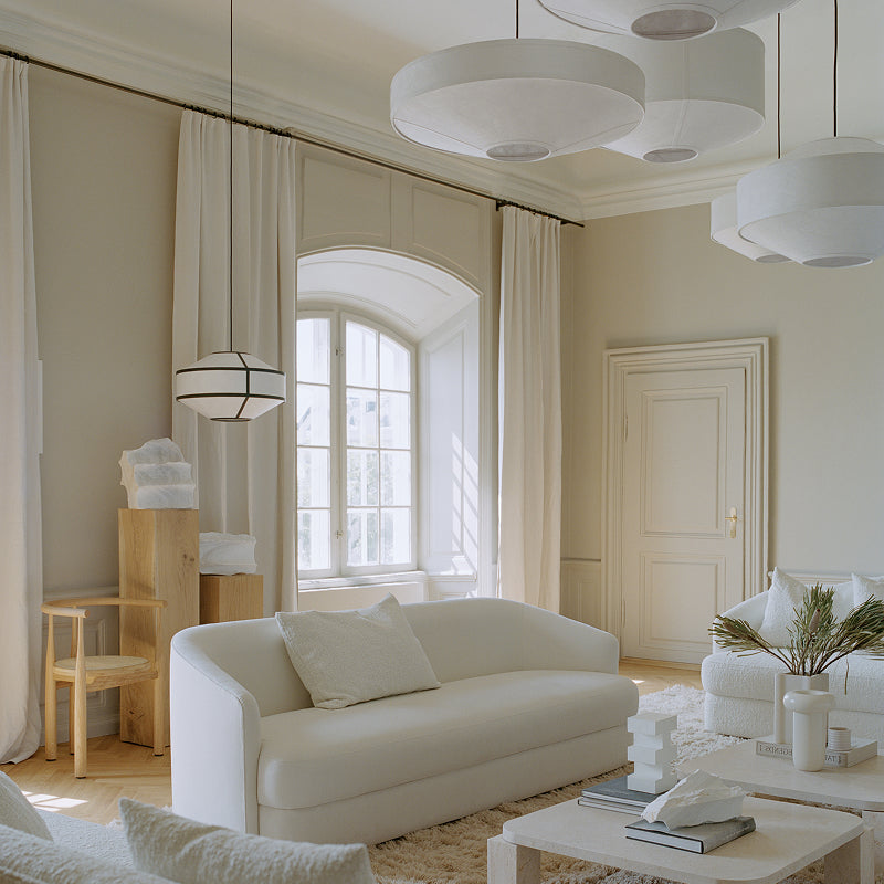 カイトはシンプルで幾何学的なフォルムと滑らかで質感のある素材が特徴のニュートラルなペンダントライトです。ランダムな繊維の表情を透過する柔らかな光は障子から漏れ出る日の光を思い起こさるもの。少しずつサイズやバランスを変え用意されたバリエーションは、多灯吊りすることで光の彫刻としての存在感も発揮します。