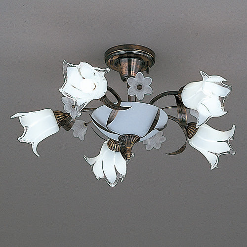 手作りの可愛らしい小型グローブに真鍮ブロンズメッキ仕上げの本体がキリッと引き締めるこのシャンデリアは、高さのない天井の部屋にもぴったりです。
