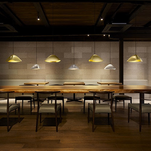 建築家 永山祐子とYAMAGIWAのコラボレーションから生まれた「フワリ」は、独特の曲線美と豊かなテクスチャが魅力のペンダントライト。セードと光源という最小限の要素で成り立つシンプルなデザインは、インテリアの中に穏やかに調和しながら華やかな彩りを与えてくれます。空間の大小を問わず、広くアレンジがしやすく、ダイニングテーブルの上からホテルの吹き抜けエントランスまで幅広いシチュエーションにお使いただけます。