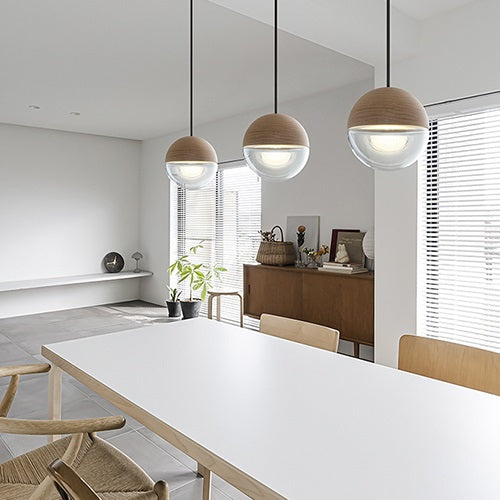 オーブは、球形を木と透明ガラスで分割したカプセルを思わせるデザインのペンダントライト。普遍的なフォルムと自然素材の風合いは、住宅やオフィス、商業施設など、幅広い空間に調和します。多灯でのアレンジがしやすく、キャノピーやダクトレールで複数を集合する活用や、有機的に散りばめることで空間をリズミカルに演出することもできます。
