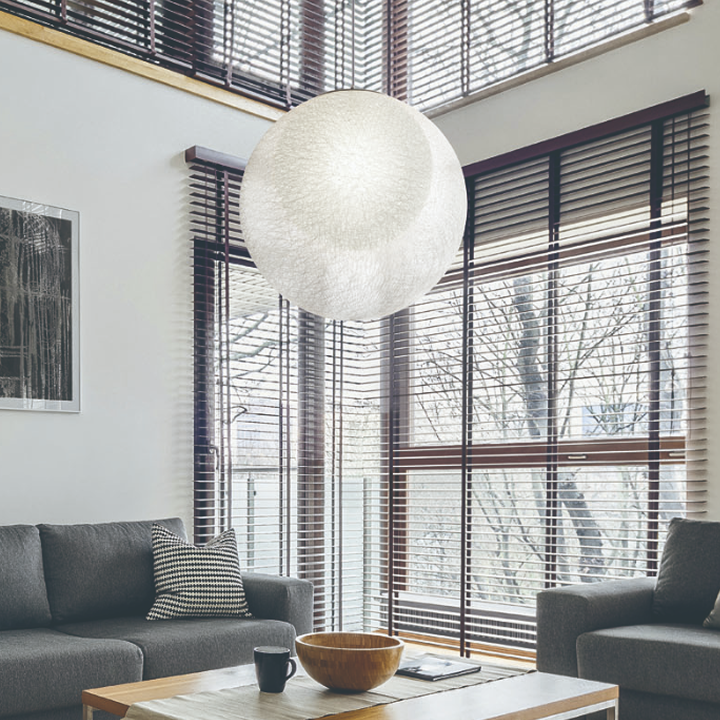 この「MAYUHANA」は二重の繭。中央のランプが放射する柔らかな光が、セードの美しいグラデーションを作ります。