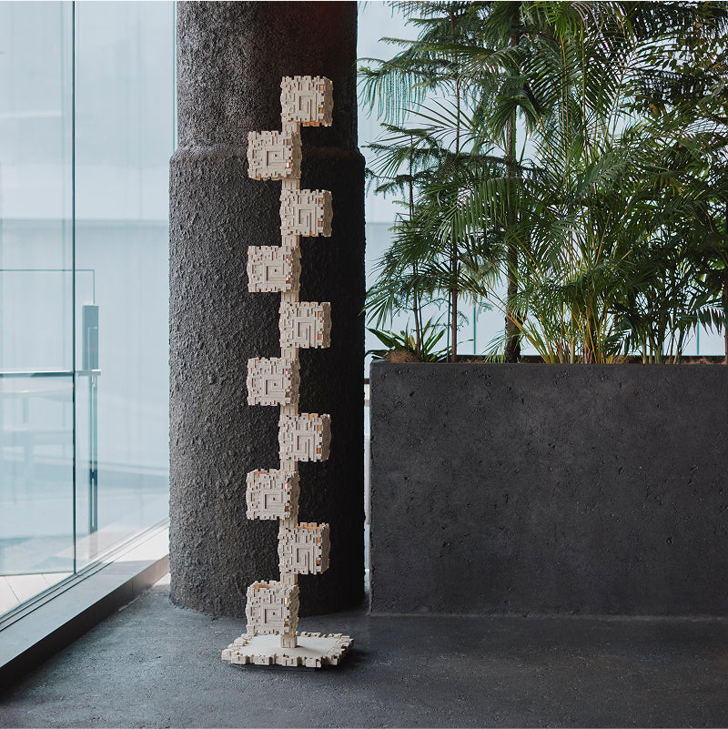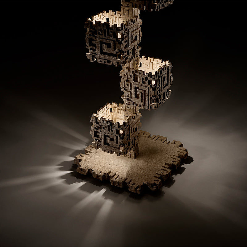 今回参加したのは2036年に完成予定の帝国ホテル新館を手がけていることでも知られる建築家、田根 剛氏です。田根氏はフランク・ロイド・ライトがマヤ遺跡にインスピレーションを抱き多くの建築を生み出したことを源流に、自身の考古学的(archaeological)手法を用いながらタリアセン2を分析。一体成型されたブロックを垂直に積み上げることで、まるで古代遺跡のような照明を創りあげました。