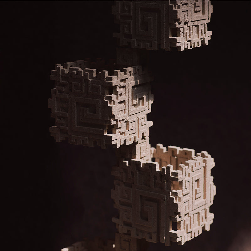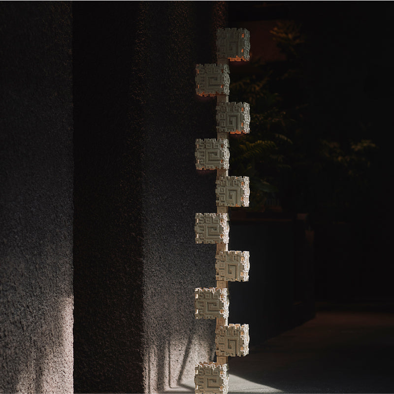「現代的であると同時に古代的な光を生み出したいと思いました。フランク・ロイド・ライトがタリアセン・ランプをデザインした当時、ライトはマヤ文明に触発されてテキスタイル・ブロック・ハウスを生み出していました。オマージュにオマージュを重ねるように、ブロックを一体成形でつくり、LED照明、構造軸、造形を一体化することを考えました。そこから照らし出される光と陰影の戯れは、幾重にも重なる光の質となって、古代と現代をひとつに繋いでいます。」