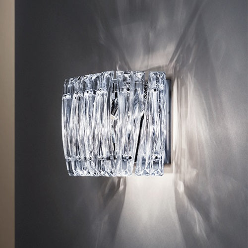 アイスクルは、不定形にデザインされたガラスパーツで形つくられたウォールライトです。クリアクリスタルタイプはIcicle(つらら)のごとくランダムに光が屈折し、ゴージャスな光のオブジェとして空間のアクセントに。スモークグレータイプは華美過ぎず大人の空間を演出します。