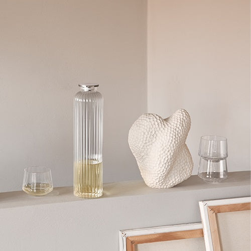 Bernadotte(ベルナドッテ)シリーズのアイコニックなカラフェは、1938年にシグヴァルド・ベルナドッテがデザインしたスターリングシルバー製のミルクジャグを基にしています。エレガントな波状のラインはアール・デコ様式のもので、様々なホーム商品のシリーズに採用されています。容量は1.1Lで、口吹きガラス製法にて生み出される無鉛のクリスタルガラスを使用しています。スリムなデザインなので冷蔵庫の扉にも収まります。