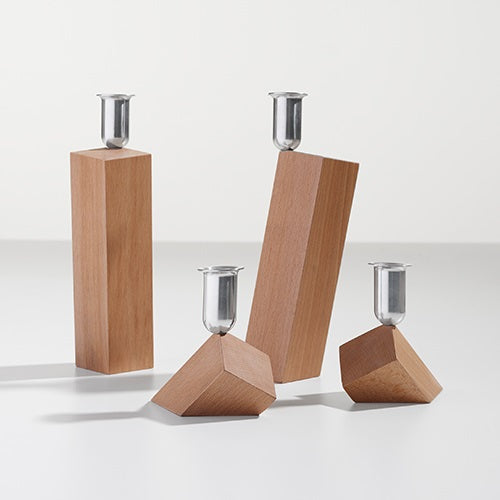 Ron Gilad(ロン・ギラッド)が手がけたTorcelloは、四角柱の木材をカットし印象の異なる 3 種類の幾何形体をつくり、その角にロウソク受けを付けたキャンドルスタンドシリーズの一つです。コレクションはヴェネツィア、ピサ、トルチェッロなどイタリアの地名に由来します。ギラッドは初期ダネーゼのプロダクトの名付け方法を意識しつつ、その地のイメージ(ピサの斜塔やトルチェッロ島の小ささ)をフォルムに結びつけています。