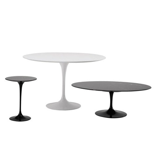 サーリネン・コレクションは、20世紀のアメリカを代表する建築家エーロ・サーリネンの作品群。テーブルシリーズはチューリップチェアと同じく一本の脚で体重を支える、ペデスタル構造。その背景には、椅子やテーブルの煩雑な足まわりを一掃したいというサーリネンの強いこだわりが美しい一体感のあるテーブルとしてデザインされています。