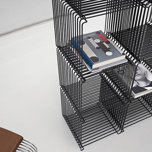 ワイヤーで構成されたブロックを組み合わせ、必要に応じたストレージを設けることができる収納システム、PantonWire(パントン・ワイヤー)。未来的なデザインは、スペースエイジ・デザインを代表するデザイナー、バーナー・パントンにより1971年に設計されました。線から成り立つブロックは、軽量で圧迫感がないだけでなく、納めたものを周囲から垣間見られる「魅せる収納」としての機能性も兼ね備えています。オプションの棚板や天板は、ブロックにサイドテーブルやローテーブルとしての機能を加えるだけでなく、木材やガラスなど異素材の質感をアクセントとして与える役割も担っています。