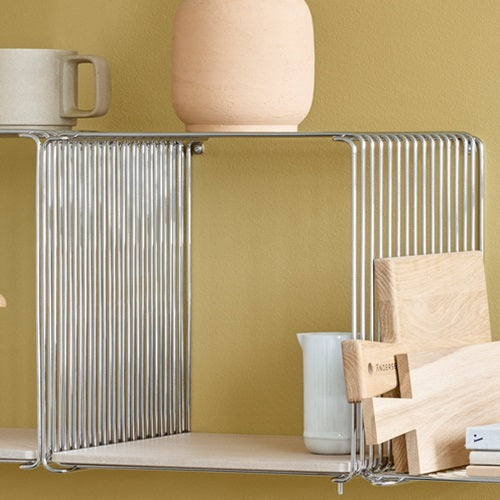 パントン・ワイヤーはトッププレート(天板)やシェルフボード(棚板)を加えることで、様々な用途に発展する拡張性を秘めています。オプションパーツには、大理石やガラス、木材など、素材や質感の異なるバリエーションがあり、インテリアに合わせた幅広いコーディネートが可能です。