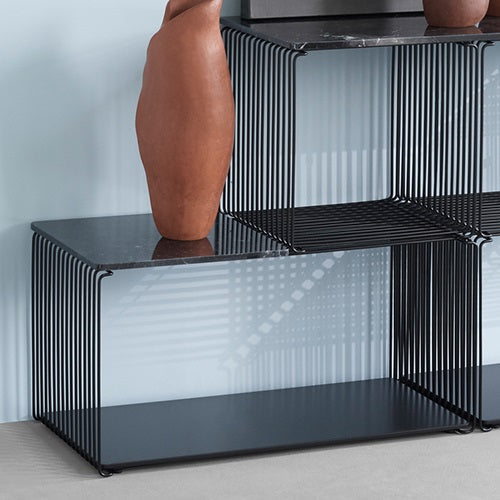 パントン・ワイヤーはトッププレート(天板)やシェルフボード(棚板)を加えることで、様々な用途に発展する拡張性を秘めています。オプションパーツには、大理石やガラス、木材など、素材や質感の異なるバリエーションがあり、インテリアに合わせた幅広いコーディネートが可能です。