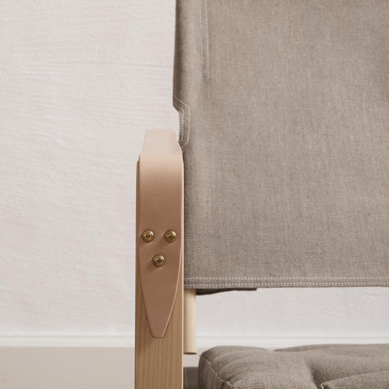 材料には、FSC認証を受けたアッシュ材をオイル仕上げで整え、軽やかで明るい雰囲気を演出。座面と背もたれは上質なキャンバス地で仕上げられ、アーム部分にはサドルレザーを使用。上品な色合いの組み合わせが、チェアに落ち着きと高級感を与えています。また一切の工具を使用せずに分解、組み立てができる構造です。