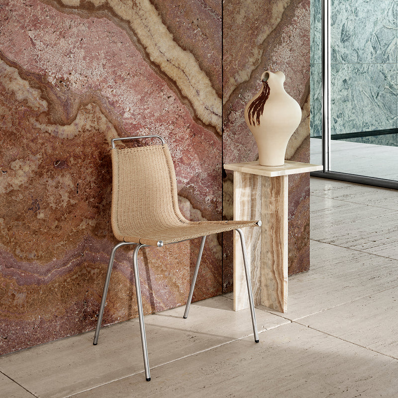 ステンレススチール製の軽快なフレームと、FSC認証されたナチュラルペーパーコードを用いた座面を組み合わせており、この座面は熟練職人による手作業で15時間かけて織られます。