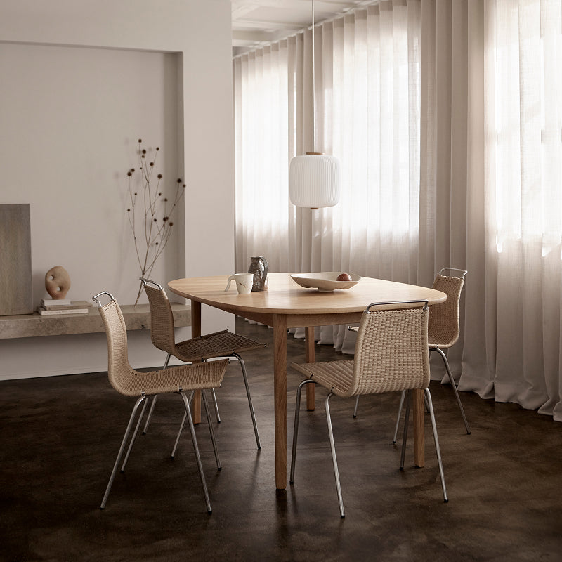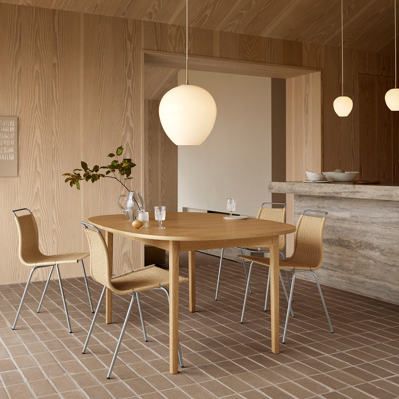 紙紐の座面は前後とも美しい織り柄を魅せ、耐久性と軽やかさを両立。現代の生活にも気兼ねなく迎えられるデザインとして、北欧モダンの定番となっています。