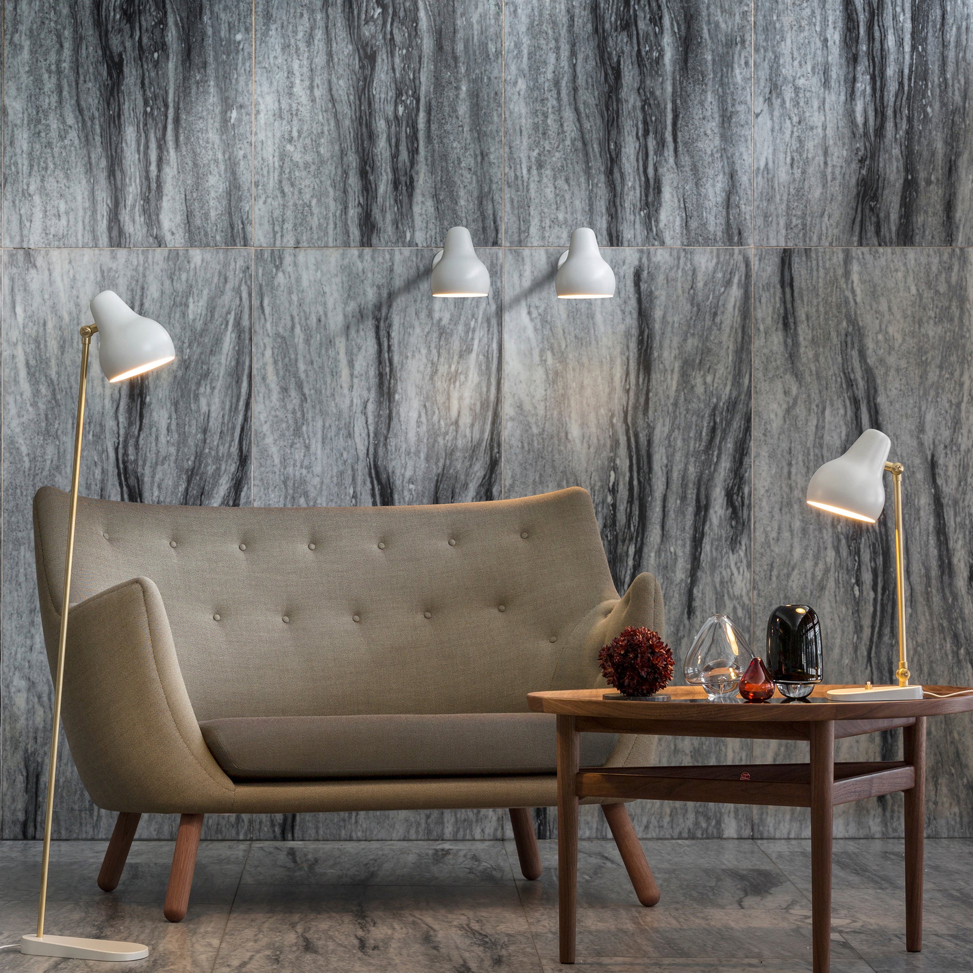 ランプのアームは真鍮製、シェードは優しく心地よい光を届けられるよう内側はホワイト塗装されています。2段階調光が可能なランプは下向きに光を放ち、シェードの角度を調整して光を最適化できます。テーブル、フロア、ウォールなど幅広いバリエーションがあり、トータルなコーディネートが可能です。