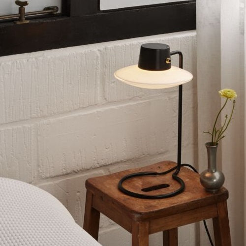AJ オックスフォードは、英オックスフォード大学を構成する38のカレッジの一つ、セント・キャサリンズ・カレッジのため、アルネ・ヤコブセンによりデザインされたテーブルランプです。AJシリーズのテーブル・フロアランプと通じるシンプルでシャープなフォルムにシェードと支柱、円形のベースが無駄なく配置されています。シェードには上面が金属製のものと、全面がガラス製のものがあり、特にガラスシェードタイプは周囲に向けて光の輪を拡散する印象的な光を放ちます。