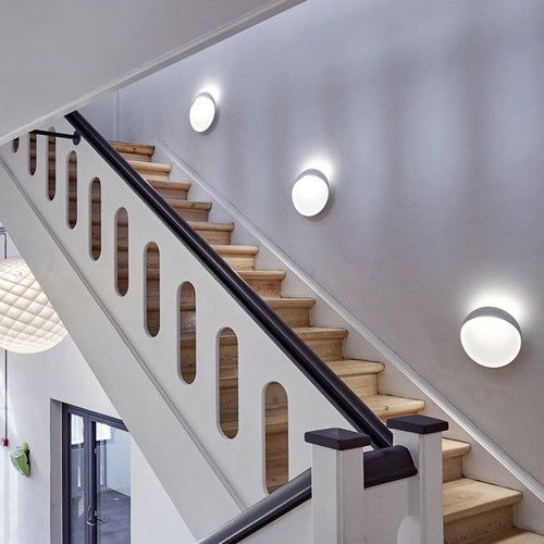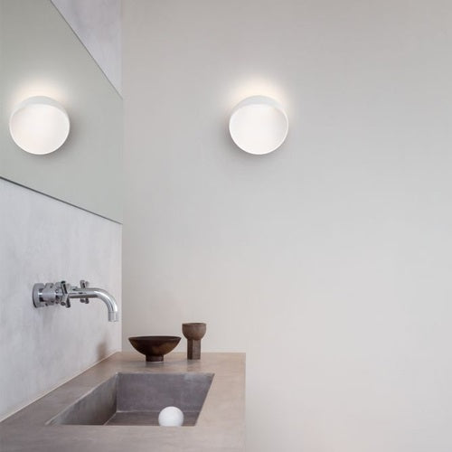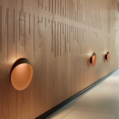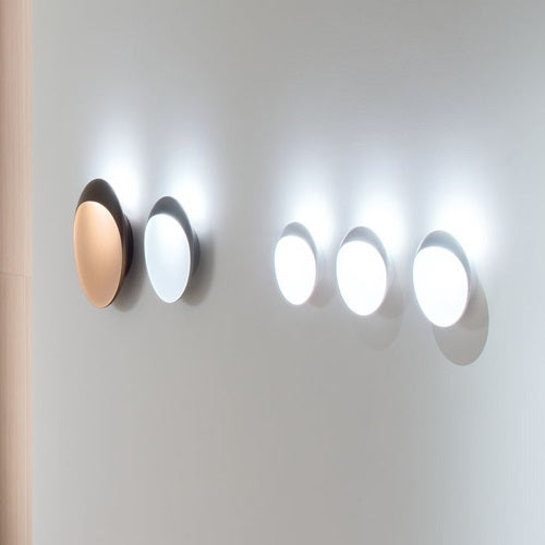 フリント・ウォールはクリスチャン・フリントが手がけたウォールライト。眩しさを見せない直接光で、下方の地面や床を明るく照らします。製品の特徴でもある、曲面に成形された円形プレートは、前方の人や物を柔らかく照らす光を生み出しています。このプレートは壁から浮いているため、器具と壁面の間に美しいコントラストをもたらします。