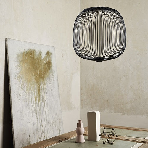 スポークスは、自転車のスポークから着想を得た、東洋のランタンや鳥かこを彷彿とさせるペンダント照明です。内部にフォスカリーニ社が独自に開発したデュアルLED回路が組み込まれ、ランプの下方向およひ周辺を暖かな太陽のような光て照らし、幻想的な幾何学模様の陰影を映し出します。フォルム・色・サイズの異なる豊富なバリエーションがあり、組み合わせることで無限の視覚・放光パターンを演出することができます。