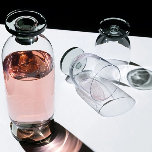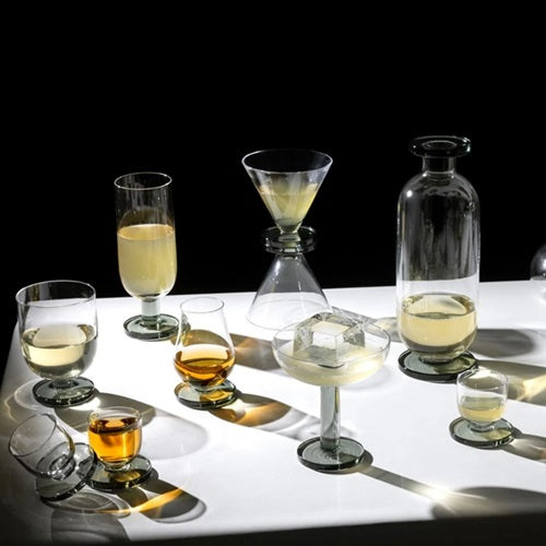 こちらのノージンググラスはスモークカラーの口吹きガラスで作られ、プロフェッショナルなカクテルシーンにも通用する実用的なアイテムです。