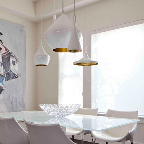 ビート・コレクションのペンダントライトには豊富なバリエーションが用意されています。カラーは「ブラス」「ホワイト」「ブラック」「グレー」の4色。フォルムは「ワイド」「ファット」「トール」「スタウト」の4つに加えて、後年追加された「フラット」「ウェスト」を含めると6つのシェードタイプがあります。テーブルスタンドやフロアスタンドのバージョンもあり、異なるフォルム、または同じフォルムのものを数灯組み合わせてコーディネートすることで、より印象的な空間を演出することもできます。