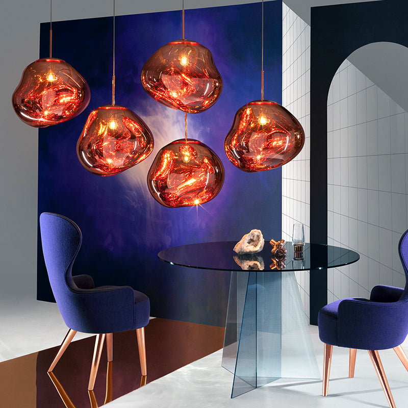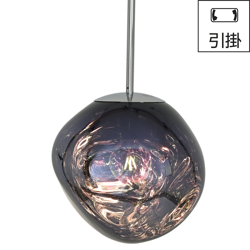 Tom Dixon(トム・ディクソン)の代表作「COPPER SHADE」ライトに”ひねり”を加えて進化させたコレクション「MELT(メルト)」。溶鉱炉で熱せられ膨らむ、吹きガラスの一瞬を切り取ったような、幻想的なフォルムが印象的な照明です。シェードはポリカーボネート製で、消灯時には鏡面加工された金属のように周囲を写し込み、点灯するとガラスのように透き通り柔らかな光が溢れるメタライズ加工が施されています。その姿はまるで固体が液体へと溶け出していくような錯覚を感じさせる独特なもので、空間に非日常的系な美しさを演出します。