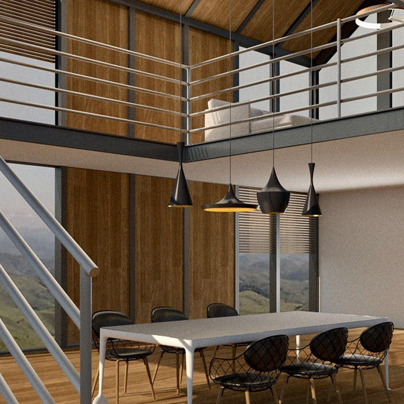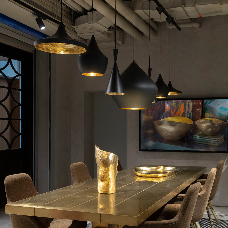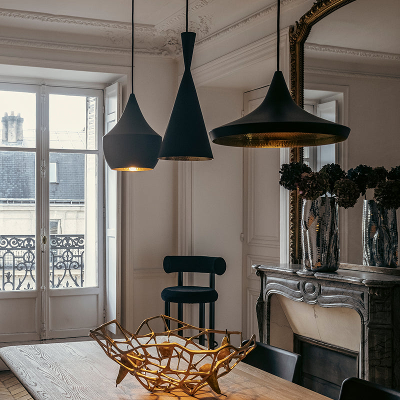 ビート・コレクションのペンダントライトには豊富なバリエーションが用意されています。カラーは「ブラス」「ホワイト」「ブラック」「グレー」の4色。フォルムは「ワイド」「ファット」「トール」「スタウト」の4つに加えて、後年追加された「フラット」「ウェスト」を含めると6つのシェードタイプがあります。テーブルスタンドやフロアスタンドのバージョンもあり、異なるフォルム、または同じフォルムのものを数灯組み合わせてコーディネートすることで、より印象的な空間を演出することもできます。