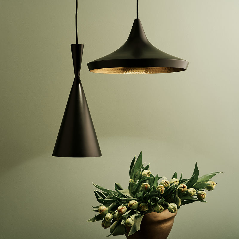 ビート・コレクションのペンダントライトには豊富なバリエーションが用意されています。カラーは「ブラス」「ホワイト」「ブラック」「グレー」の4色。フォルムは「ワイド」「ファット」「トール」「スタウト」の4つに加えて、後年追加された「フラット」「ウェスト」を含めると6つのシェードタイプがあります。テーブルスタンドやフロアスタンドのバージョンもあり、異なるフォルム、または同じフォルムのものを数灯組み合わせてコーディネートすることで、より印象的な空間を演出することもできます。