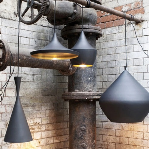 ビート・コレクションのペンダントライトには豊富なバリエーションが用意されています。カラーは「ブラス」「ホワイト」「ブラック」「グレー」の4色。フォルムは「ワイド」「ファット」「トール」「スタウト」の4つに加えて、後年追加された「フラット」「ウェスト」を含めると6つのシェードタイプがあります。テーブルスタンドやフロアスタンドのバージョンもあり、異なるフォルム、または同じフォルムのものを数灯組み合わせてコーディネートすることで、より印象的な空間を演出することもできます。