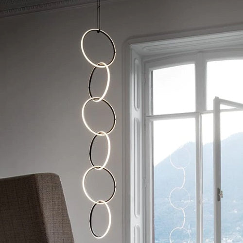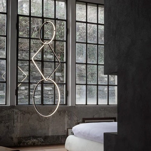 光の彫刻と工業デザインの中間に位置するアレンジメンツは、円形やひし形・ティアドロップ形・直線などの各エレメントを自由に組み合わせるエレガントで美しいジュエリーのような照明です。エレメントをつなぐジョイントはアレンジメンツ のために開発された特許取得済みのコンポーネントを介して接続され、全体に電源を供給しています。このシステムによりエレメントの形や順序、数量を自由に組合せることができます。