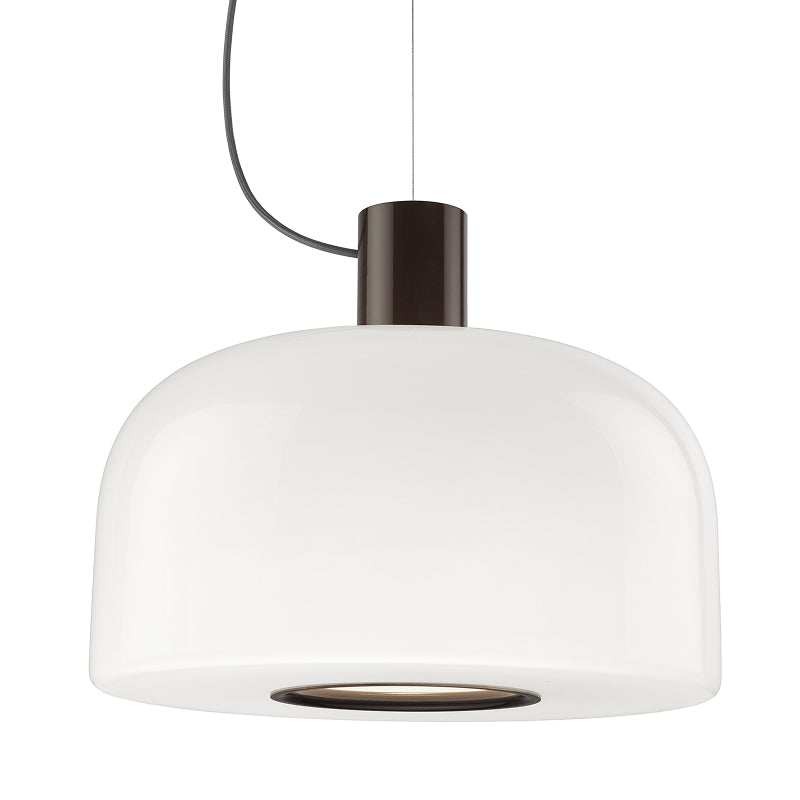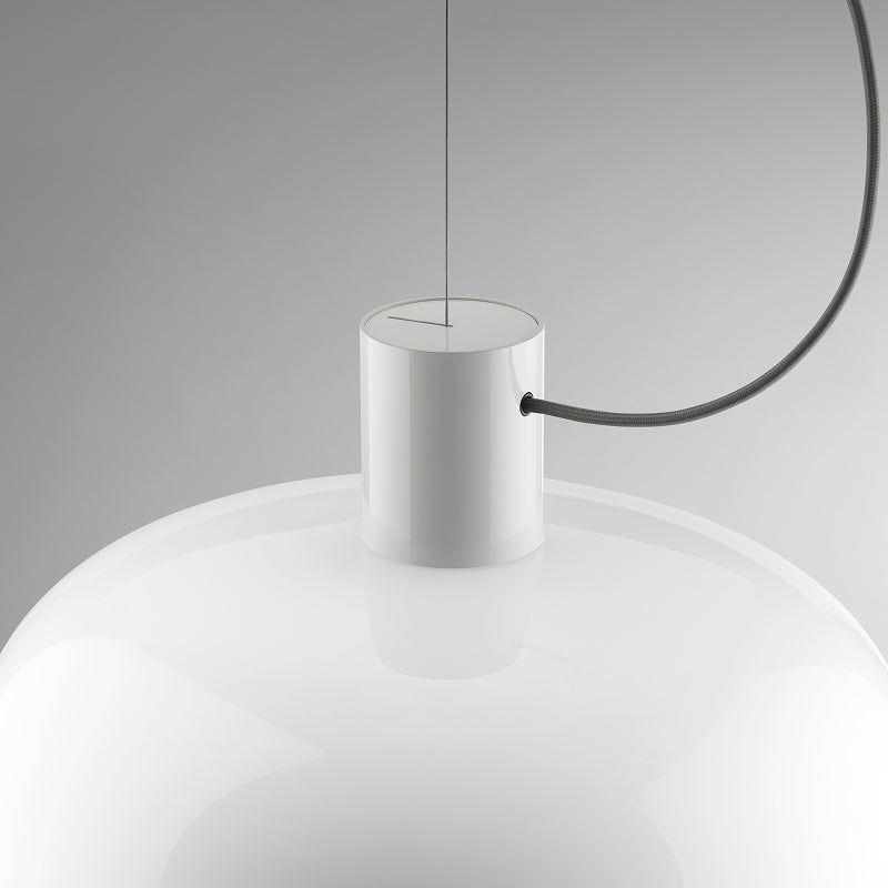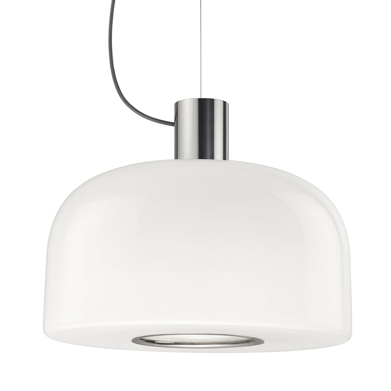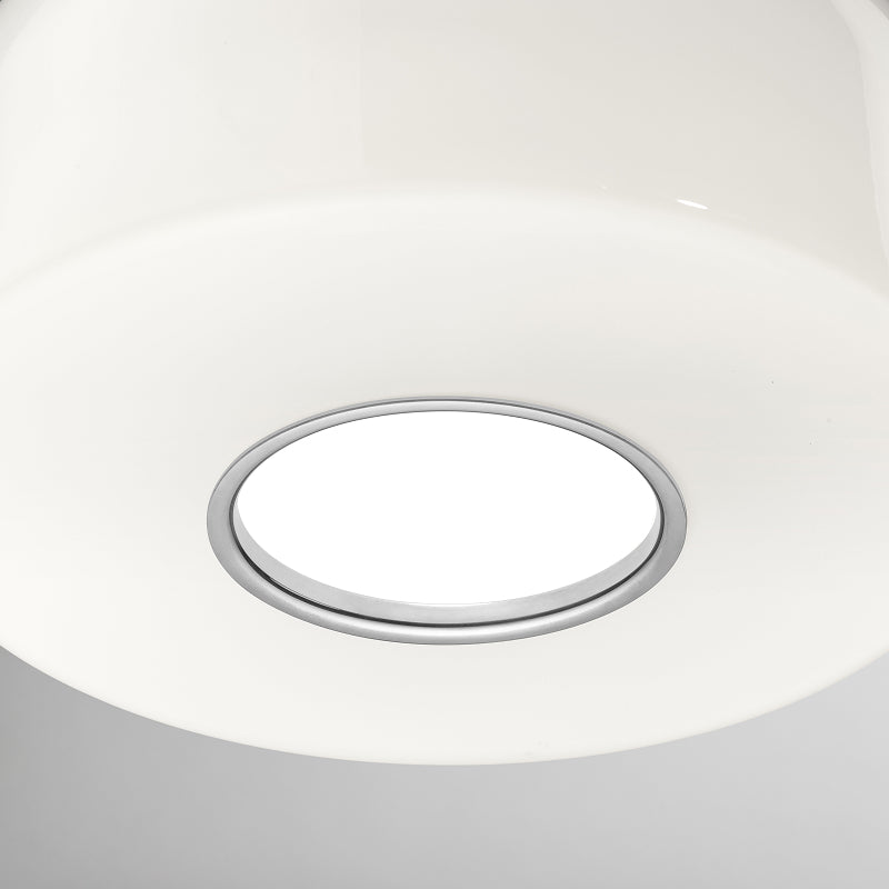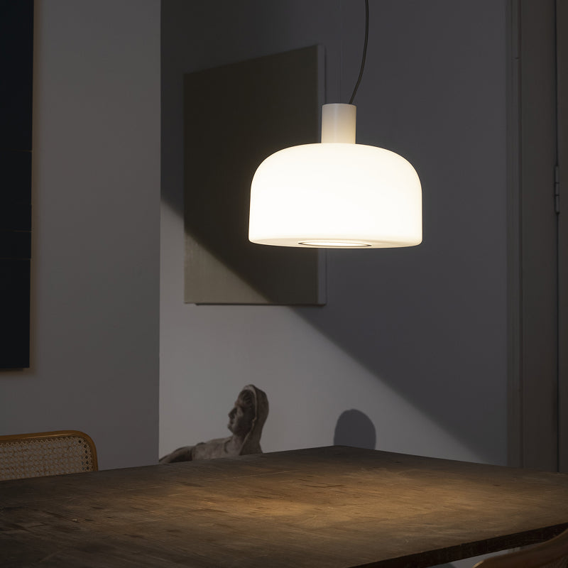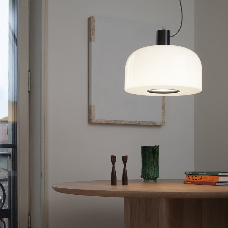 Bellhop Glass Pendantは、Barber OsgerbyとFlosによる、Bellhopの象徴的なシェードを吹きガラスで再構築したモデルです。直径33cmと45cmのサイズから選べ、三層の乳白ガラスが眩しさを抑えて空間全体を柔らかく照らします。上下の開口部により、間接照明としてもタスクライトとしても活躍。上部のアルミシリンダーと精巧なディテールが、Bellhopらしい造形美を演出します。光と素材の質を追求した、時代を超える普遍的なデザインです。