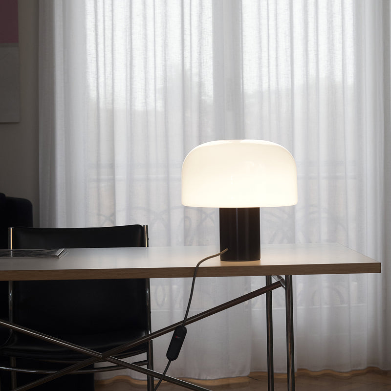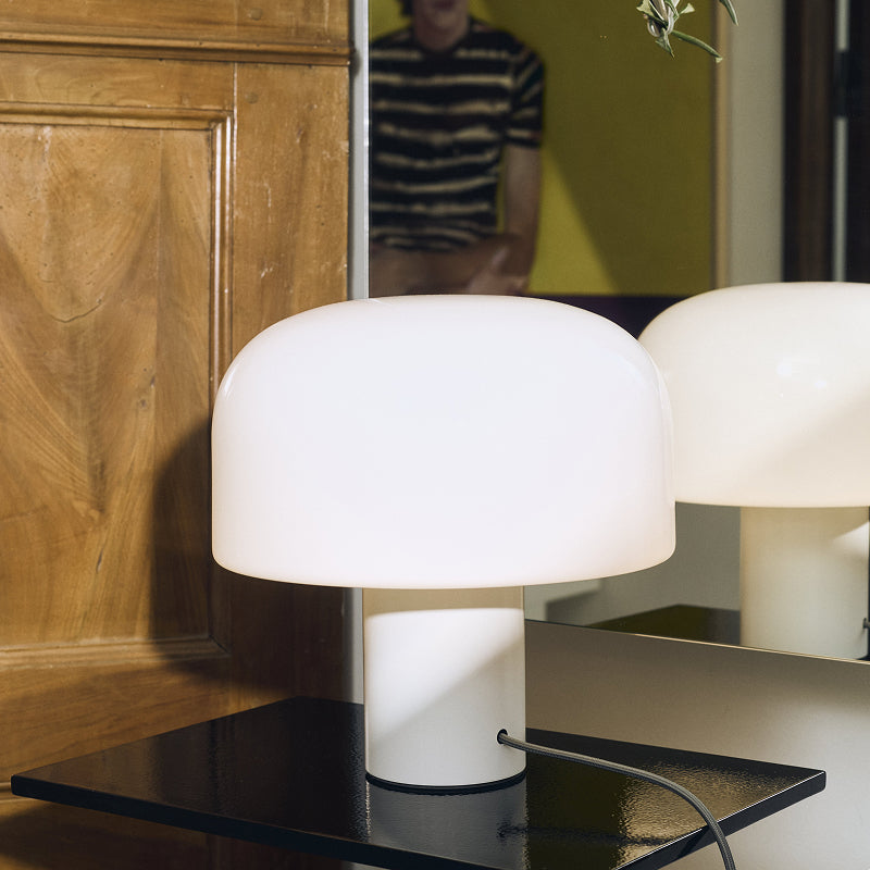 Barber OsgerbyがFlosのためにデザインしたBellhop Glass Tableは、ブランドを象徴するベル型シェードを吹きガラスで再解釈した新しいコレクションです。三層構造の乳白ガラスが、空間に柔らかく均一な光をもたらします。直径33cmのシェードと光沢仕上げのアルミ製円筒ベースが組み合わされ、構造的な美しさと実用性を両立。シンプルでありながら温かみのある存在感は、どこに置いても心地よい雰囲気をつくり出します。リサイクル可能な素材を用い、環境への配慮も備えたモダンなテーブルランプです。