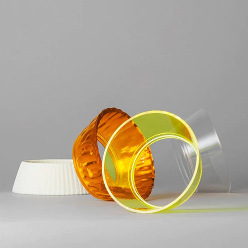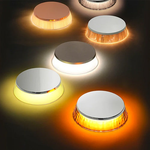ボンジュールはアクリル樹脂の本体とセード、トップカバーから構成されています。 トップカバーははマットクローム・クローム・カッパー(銅色)・ホワイトの4色。シェードはクリア・イエロー・アンバー(琥珀)・スモーキーグレー・ソフト(ファブリック)の5種類で、2つを組み合わせることで20種類もの豊富なバリエーションを生み出しています。シェードはマグネット方式で簡単に取り外しが可能で、他のカラーと交換して楽しむこともできます。
