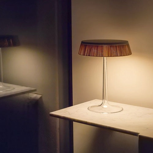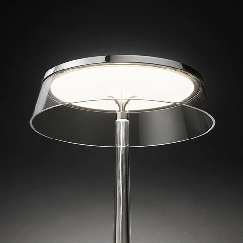ボンジュールは、フィリップ・スタルクがデザインした、周囲に優しい拡散光を届けるテーブルスタンドです。ディフューザーを含めた本体はアクリル樹脂製で、光を受けて輝く姿は物質感のない、幽玄な存在感です。トップカバーとシェードはそれぞれ豊富なカラーから組み合わせられ、ワンタッチで交換もできる仕様なので、シーンや好みに合わせて装いを変えることができます。