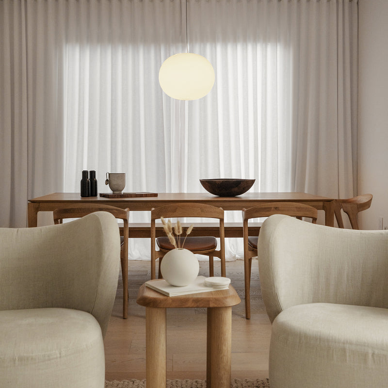 GLO-BALL(グロー・ボール)は1998年、ロンドンに生まれのデザイナー ジャスパー・モリソンによって発表された、シンプルなフォルムながらも存在感と安定感を感じる照明です。「よい製品とは、短いスパンではなく、何年経っても使い続けれもらえるような、謙虚で静かな、そして暮らしの中で便利な道具である」という信念に基づき設計され、Achille Castiglioni (アッキーレ・カスティリオーニ)のARCO(アルコ)や、Michael Anastassiades(マイケル・アナスタシアデス)のIC Lightsと並んで大きく支持を集め、FLOS(フロス)社のブランドを世界に印象付けた名作照明です。