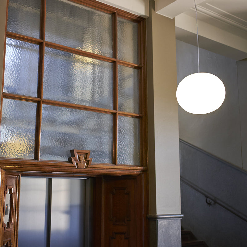 大きな丸い光が空間に浮かび、物静かななかに独特の存在感を感じさせます。デザインはミニマルデザインの旗手、ジャスパー・モリソンが手掛けました。