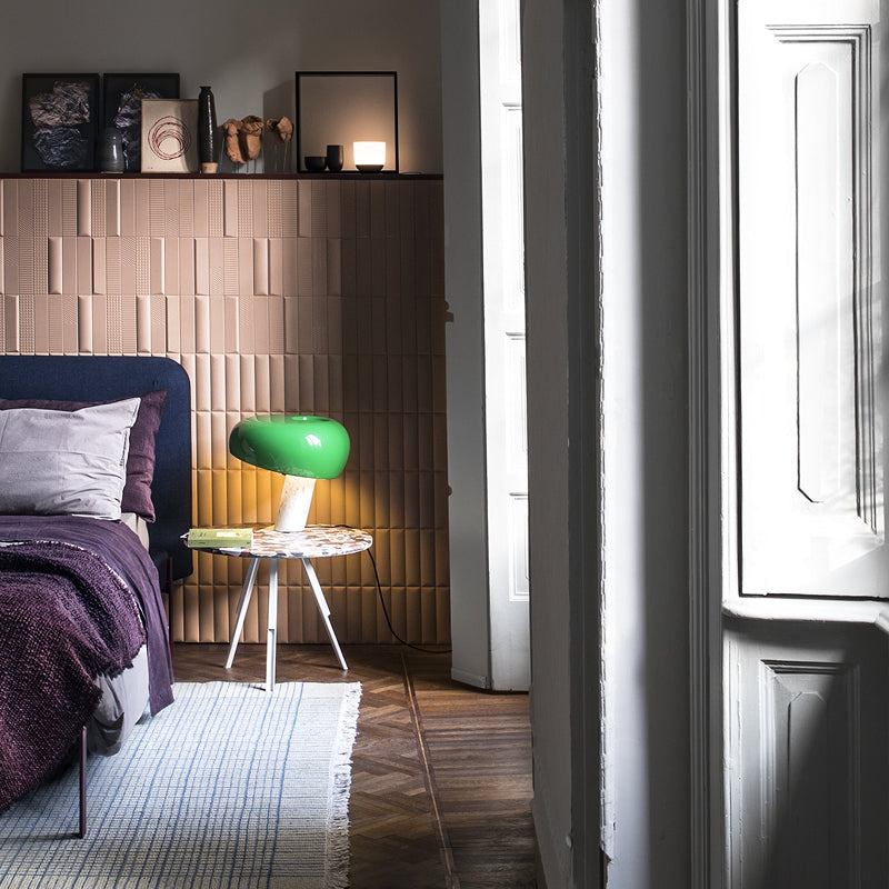 発表以来、オレンジやグリーンなどの大胆なカラーバリエーションが展開されてきましたが、後に鮮やかなブルーカラーが加わっています。この「ネイビーブルー」はカスティリオーニ兄弟が1966年に発表した豊かなカラーバリエーションで人気を博した多機能ライトSciukoランプからインスピレーションを得たものです。