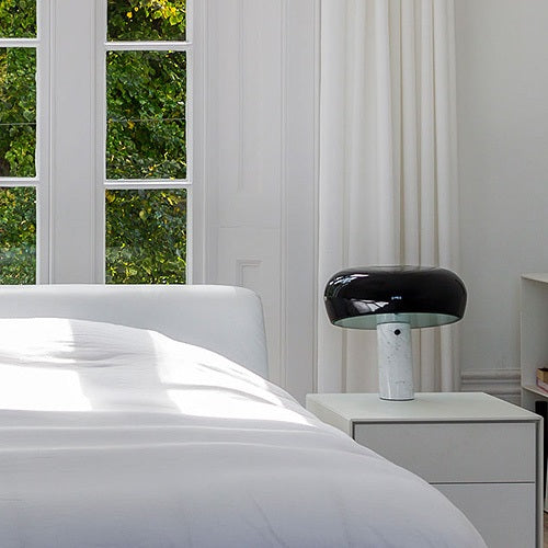 重厚な大理石製の円筒形ベースは、光の広がりを計算し後ろに傾斜。大きなシェードとのバランスが絶妙です。調光可能なスイッチが付いています。