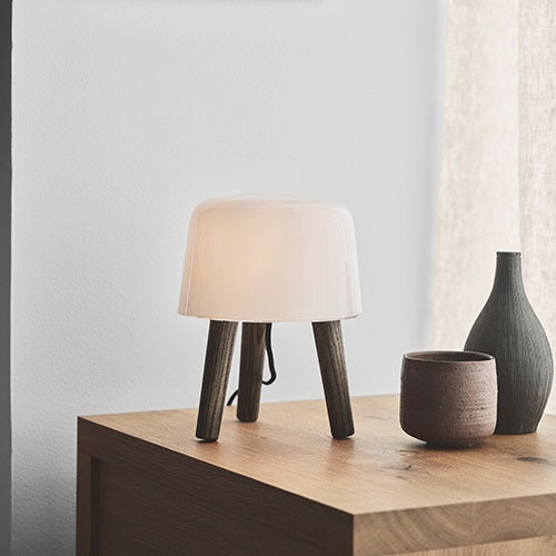 ノーム・アーキテクツは、北欧の伝統的な木材とガラスより現代的な視点で活用し、これまでにない、モダンであり、どこか温かみのあるデザインに作り上げました。照明としての機能はもちろんのこと、空間の中でモダンなオブジェとしての役割も担います。家の隅々にミルクを配置する事で、それらから放たれる柔らかな光が空間に充満する事で、居心地の良い雰囲気を作り出すことがデザイナーの狙いです。シェードはガラスで出来ていますので取扱いにご注意下さい。