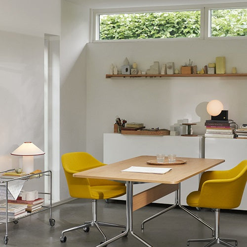 Journey(ジャーニー)は、球体と長方形という2つの幾何学立体が融合したモダンなフォルムのランプです。オパールガラスのシェードからは、満月を思わせる柔らかな光が溢れます。デザインのアイキャッチにもなっている金属製のノブは調光器になっており、光の強さを自由にコントロールすることができます。