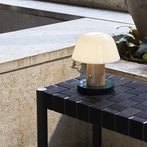 スペイン語でキノコを意味する「Seta(セタ)」は、風変わりなキノコのようなプロポーションを示しています。また「go」はこの照明のコードレス構造を指し、どこにでも移動できることを意味しています。シェードに施されたスタイリッシュな上向きのカーブや真鍮の調光スイッチも特徴的なデザインのひとつです。
