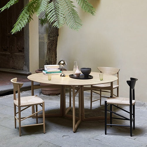 1956年に発表されたドローンチェアは、デンマークデザインの代表作として知られています。伝統的な職人技とオーガニックな素材で作られたこのチェアは、どんな空間にも健全で誠実な感覚をもたらしてくれます。カラーは、オイルドオーク、オイルドウォールナット、ソープドオーク、そして新たに加わったブラックラッカー仕上げのオークです。アームレストが付いたワイドモデルと、アームレストのないモデルの2種類をご用意しています。