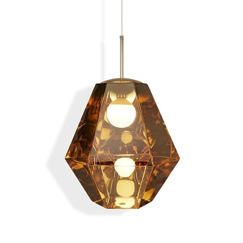 CUT(カット)はダイアモンドカットの多面体に真空蒸着メッキを施すことで「反射と透過」という2つの状態を内包した照明コレクションです。点灯することで、磨かれた金属のような質感から、近未来の切子細工のような表情へと変化する姿は、宝石のようにきらめく万華鏡にインスパイアされたというエピソードを感じさせるものです。ファッショングラス等で採用されるハーフミラー効果ですが、照明への採用には、トムディクソンとドイツのエンジニアリングの緊密な協力が必要でした。ブランドの光による視覚効果における飽くなき探求心を象徴する照明です。