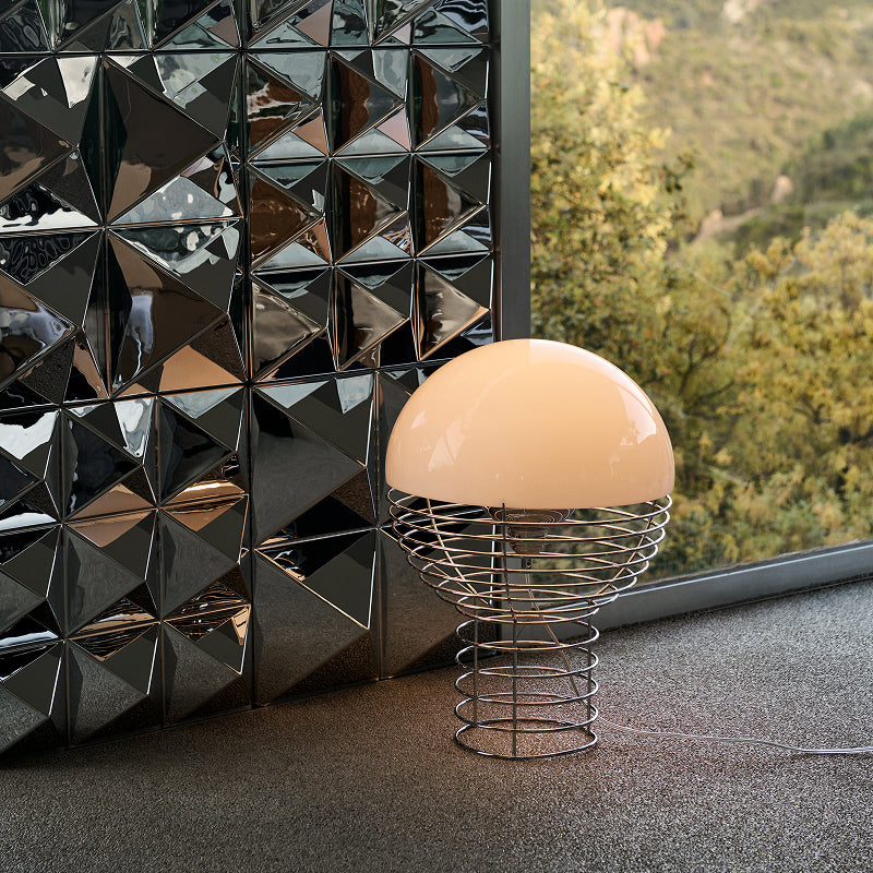 ワイヤーは、立体的なワイヤーフレームが特徴の照明コレクション。クロームメッキのスチールワイヤーが円筒と半球を形作り、ドーム状のプラスチックシェードを支えています。電球は半球状の小さな金属リフレクターに収められており、光をシェードの内側へと導きます。この構造により、眩しさのない豊かな間接光が生まれます。