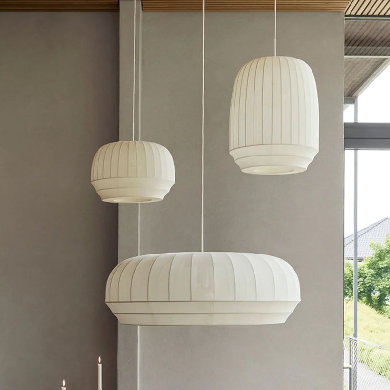 シェードにはポリエステル素材を使用し、紙のような温かみと現代的な耐久性を両立。和紙や布のような柔らかさを持ちながら、洗練された存在感を放ちます。点灯時・消灯時どちらも美しく、ダイニングやリビングを上質に演出します。