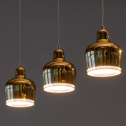 現在も手作業で仕上げられる継ぎ目ない曲線美と、黄金色の輝きから「ゴールデンベル」の愛称で親しまれるペンダントライト、A330S。アルテック設立から間もない1937年に、アルヴァ・アアルトによりデザインされた同社のクラシックデザインであり、屈指の人気照明です。光は主に下向きの開口部から照らされるため、眩しさを感じないグレアフリー設計。点灯時にはシェードのエッジに刻まれた微細な孔が、一連の光輪のように発光するユニークな特徴があります。