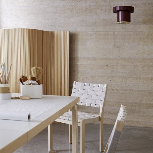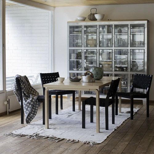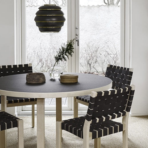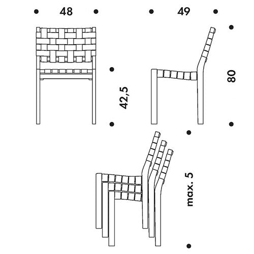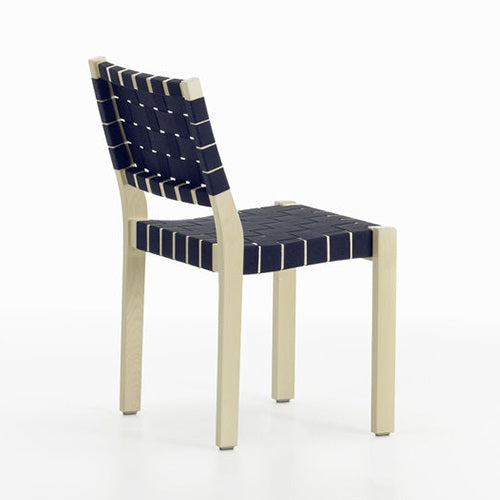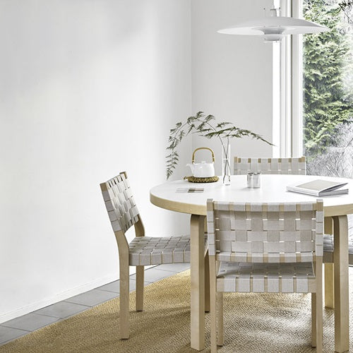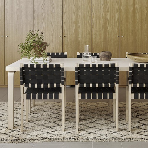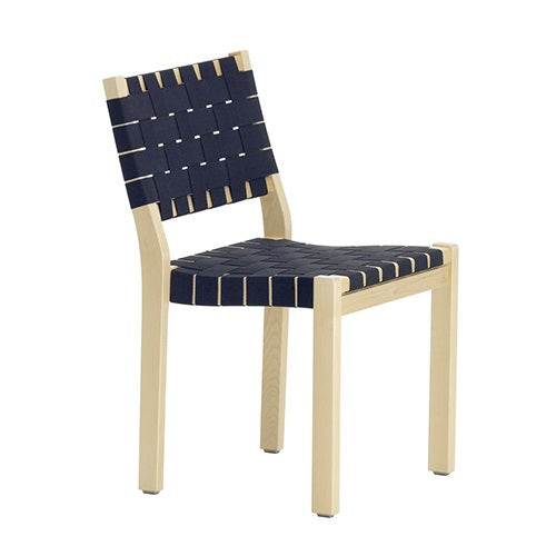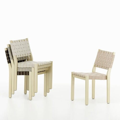 フィンランドの巨匠、Alvar Aalto (アルヴァ・アアルト)初期の家具デザインの一つ、「611」チェア。バーチ材のフレームとリネンのウェビングテープによって構成されています。十字に編み込まれたリネンテープは体重を優しく受け止め、座面や背もたれに快適な座り心地を与えるサスペンションの役割を果たしています。テープは交換も容易なため、何代にも渡って使用できる設計。北欧の自然や道具への考え方が反映されたサステイナブルなデザインになっています。スタックは4脚まで可能。コンパクトに収納できます。