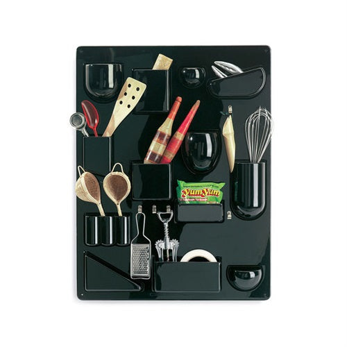 金属フックと様々な形とサイズのポケットがあるウーテン シロは、オフィス、キッチン、作業場、バスルーム、子供部屋など幅広いシーンの整理整頓に役立ちます。1969年からのオリジナルサイズの「ウーテン シロ 1」1970年代版の小型サイズの「ウーテン シロ 2」が白・黒・赤の3色カラー展開。