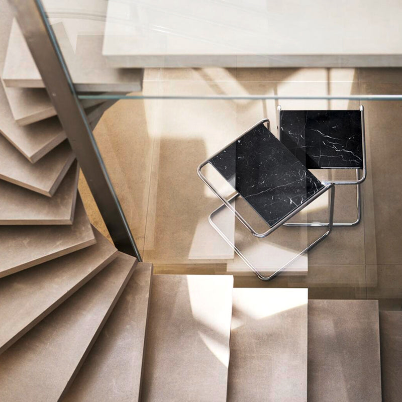 NORIDIC ラインでは、温かみのあるマットニッケルシルバー仕上げのフレームを使用して名作家具に新たな魅力を与えています。S 64の座面と背もたれにはナチュラルカラーの革張り、もしくは淡い色調のケインワークを選べるようになっており、木製フレームとアームレストには、北欧家具を思わせるホワイトオークが採用されています。B97のテーブルトップは、マットでグレイッシュな大理石が設定されています。